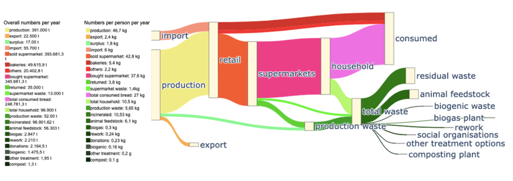 The RUE introduces a systematic method to uncover how materials circulate within a region. The process begins with the collection and standardisation of data on biomass availability and use — spanning agricultural residues, food industry by-products, and organic waste from households and municipalities. These datasets are transformed into Sankey diagrams that visualise how matter moves between production, processing, consumption, and disposal. By making hidden flows visible, the diagrams highlight inefficiencies, losses, and potential synergies between rural suppliers and urban consumers.